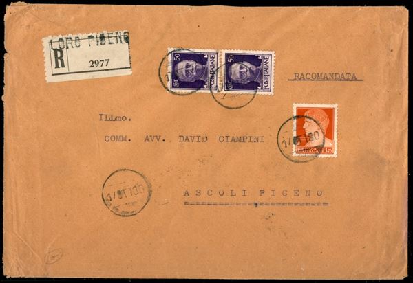 Annullo muto 17.10.30 su raccomandata tre porti con coppia del 50 cent Imperiale + 1,75 lire da Loro Piceno per Ascoli Piceno