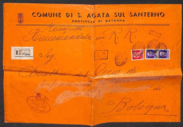 Annullo muto ovale a sbarre con data 29.1.1940 con a lato lineare su due righe Sant'Agata sul Santerno su raccomandata con 20 cent + coppia 50 cent Imperiale per Bologna
