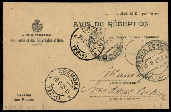 Avviso di ricevimento con coppia del 30 cent su 50 cent (180) - modulo per l'estero usato per l'interno - ex coll. Provera