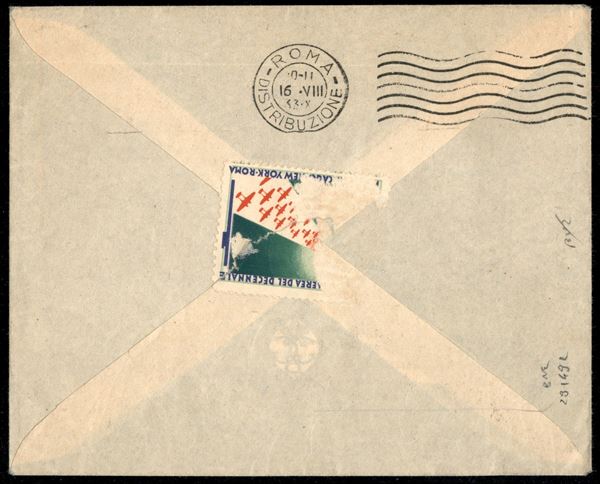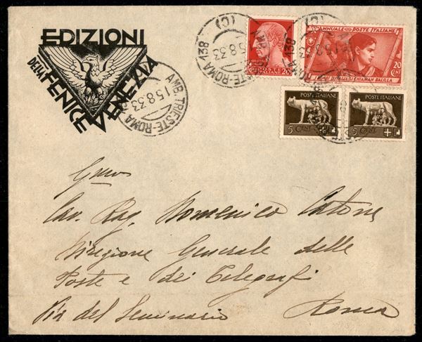 Bella busta pubblicitaria Edizioni della Fenice Venezia affrancata con due esemplari 5 cent Imperale (243) + 20 cent carminio Imperiale (247) + 20 cent carminio Marcia su Roma (328) - annullo Amb. Trieste - Roma 5.8.33