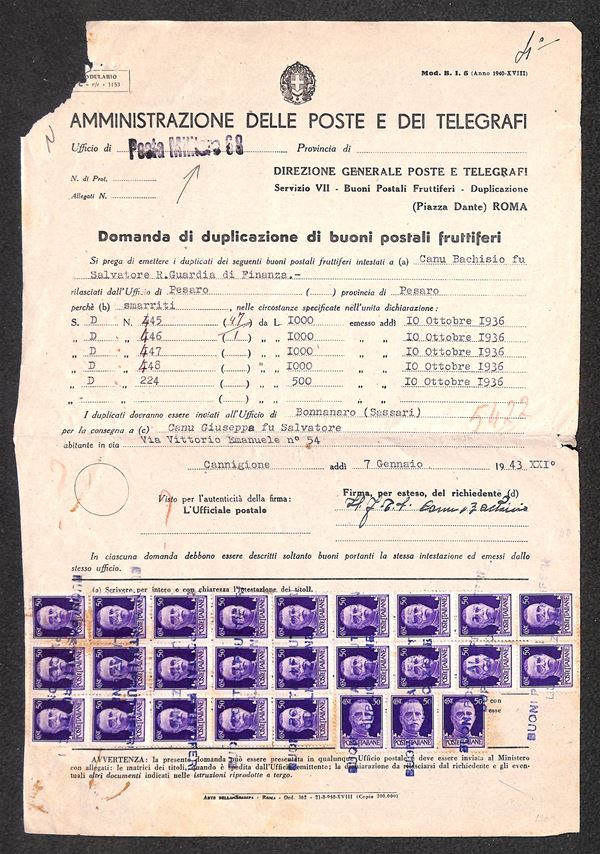 Buoni Fruttiferi Postali Duplicazione a tampone su 26 pezzi del 50 cent (251) - intero modulo Domanda dalla Posta Militare 68 - Cannigione 7.1.43