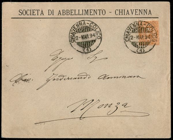 Busta affrancata con 20 cent Umberto I (39) annullato con ambulante "Chiavenna - Colico" (1) del 2 mar. 94 per Monza - ex coll. Provera