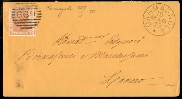 Busta affrancata con 20 cent V. Emanuele II (28) da Carmagnola per Loano del 10 mag. 79 - ex coll. Provera