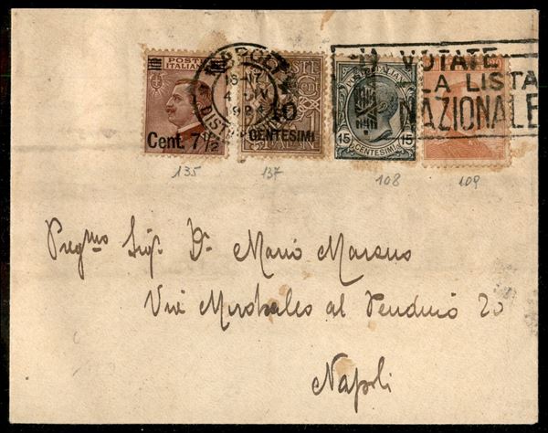 Busta da Napoli 4.4.24 per cittą affrancata con quattro valori diversi (135 + 137 + 108/9) - ex coll. Provera