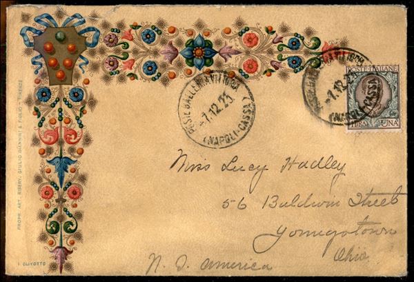 Busta decorata da Napoli 7.12.23 per gli Stati Uniti affrancata con 1 lira Floreale (77) - ex coll. Provera