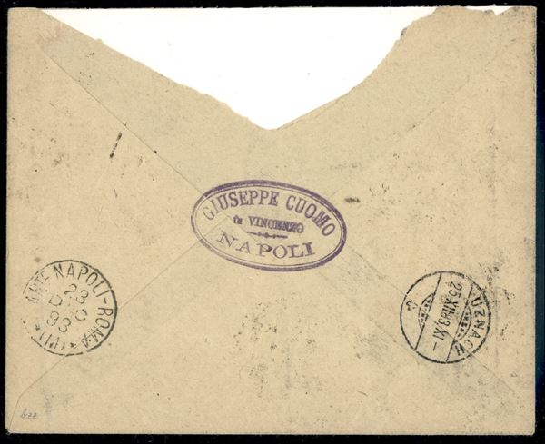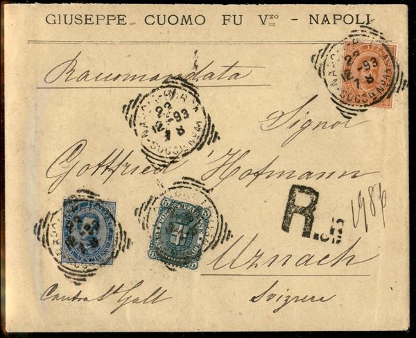 Busta raccomandata tricolore affrancata con 20 + 25 cent Umberto I (39 + 40) + 5 cent Stemma (44) da Napoli per la Svizzera del 23.12.93