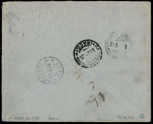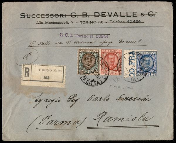 Busta raccomandata viaggiata 30.3.25 con affrancatura Floreale tricolore (202 + 201 + 77) - ex coll. Provera - ED