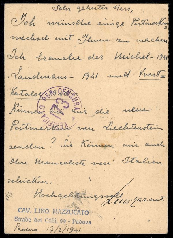 Cartolina postale con affrancatura aggiuntiva da Rovigo 18.2.41 per la Svizzera