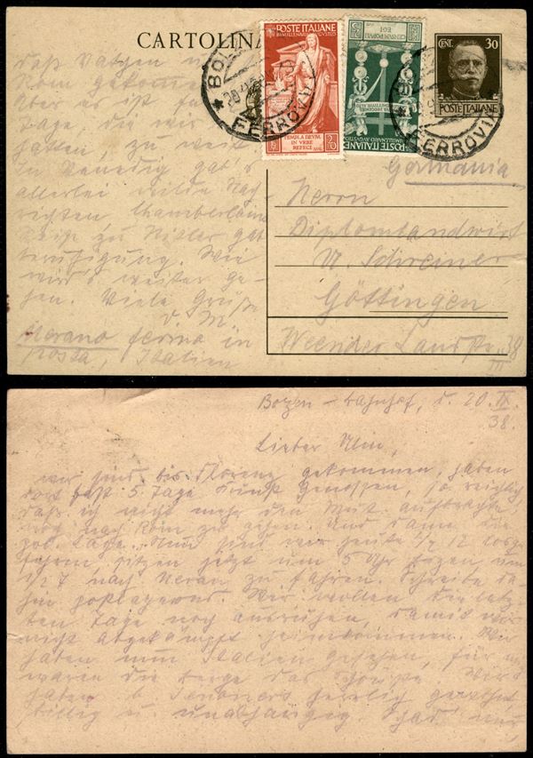 Cartolina postale da 30 cent (C80) con complementari (418+419) da Bolzano a Gottingen del 20.9.1938