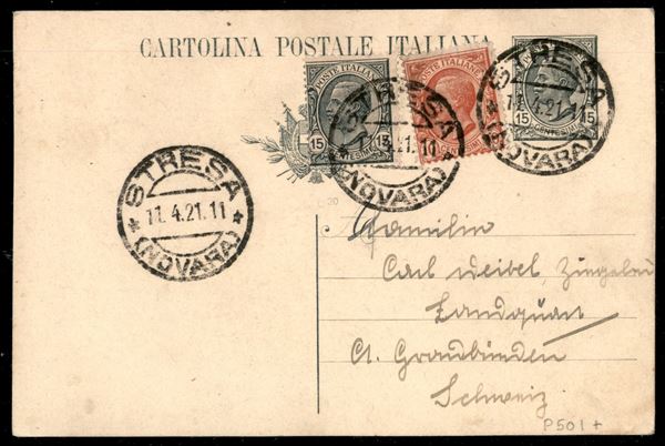 Cartolina postale da Stresa 11.4.21 con affrancatura aggiuntiva e valore gemello