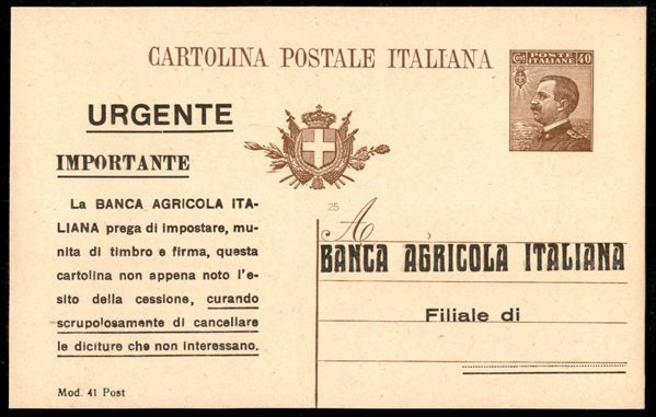 Cartolina Postale Michetti 40 cent stemma primo tipo (C56) con testo e stampa Banca Agricola Italiana - nuova