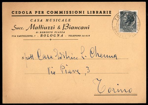 Cedola di Commissione libraria con 5 lire Siracusana (762) da Torino per cittą del 18.3.57