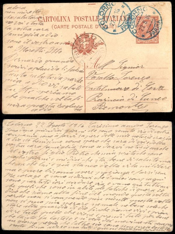 Colorno/Parma 22.8.16 (azzurro) - cartolina postale da 10 cent (C36) per Priero