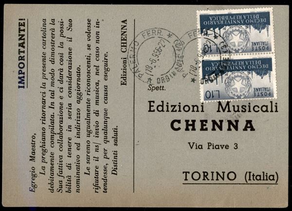 Coppia del 10 lire X Anniversario della Repubblica (798) su cedola di commissione libraria da Palermo a Torino del 18.6.956