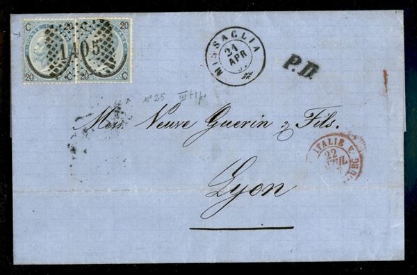 Coppia del 20 cent Ferro di cavallo (25) su lettera con annullo np. 1405 + Missaglia 31 apr.67 per Lione