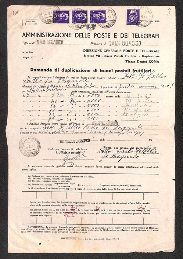 Duplicazione Buoni Fruttiferi - quattro 10 lire (258) su intero modulo Domanda - Mirabello Sannitico 18.8.44