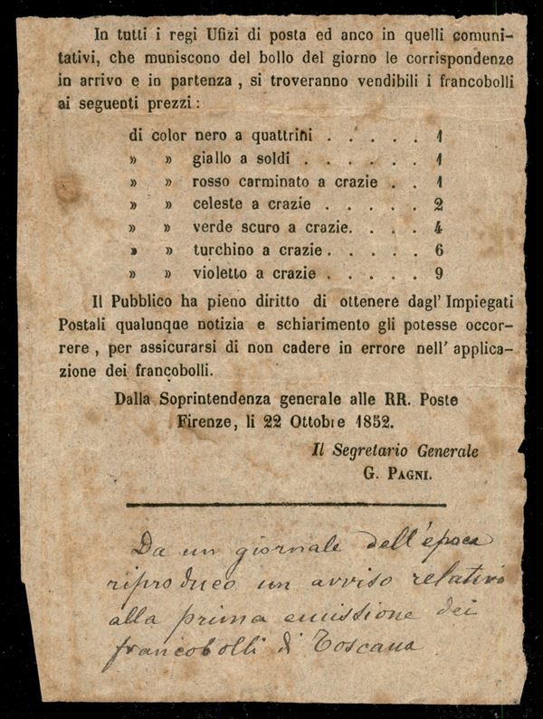 Firenze 22 ottobre 1852 - ritaglio di giornale con annuncio delle RR Poste sulla vendita dei valori della prima emissione