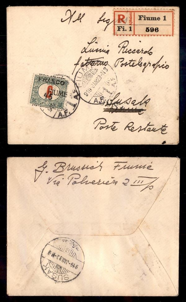 Franco 45 su 6 filler (29cbb + e) - sbarretta a cavallo + Fiume a destra - bustina raccomandata per Susak del 29.1.19