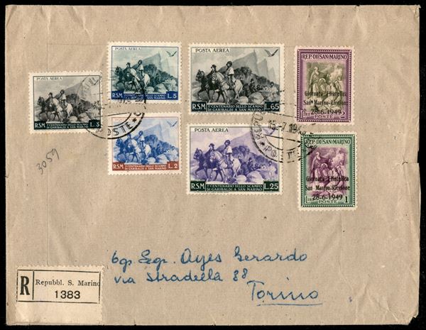 Garibaldi serie completa + posta aerea 13 valori + Giornata Filatelica serie completa 2 valori (356/57 + 358/95 + Aerea 77/81) su due lettere del 15 e 31.7.49 per Torino con bollo d'arrivo