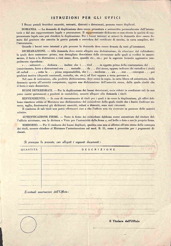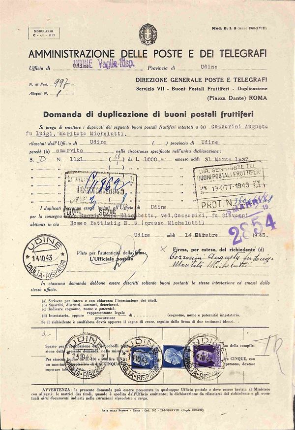 Imperiale - 50 cent (251) + coppia del 1,25 lire (253) su intera Domanda di Duplicazione (Mod. B.I. 5) - Udine 14.10.43
