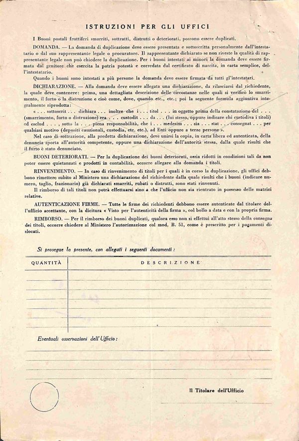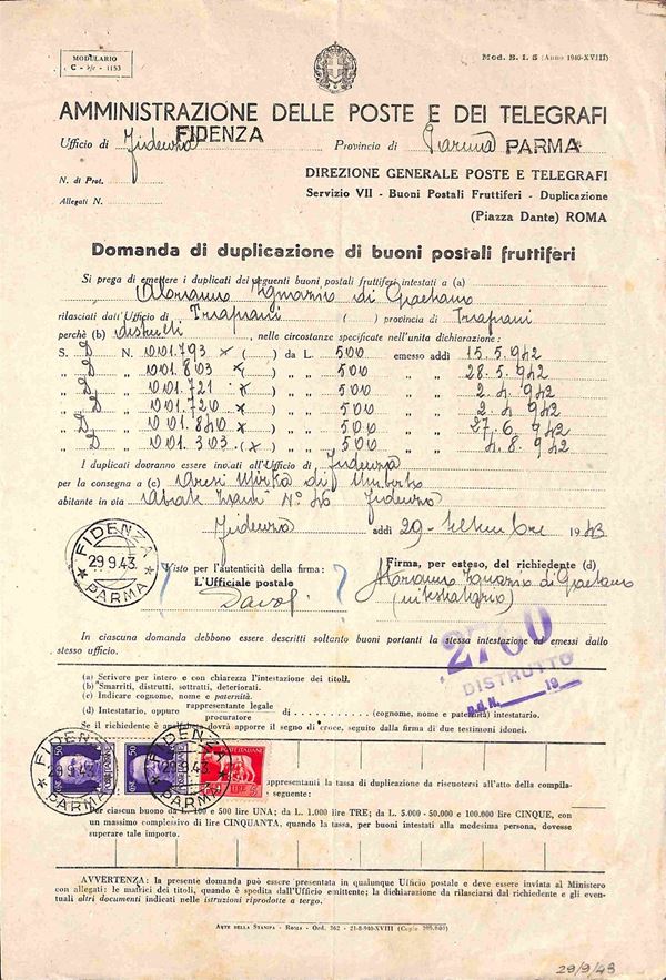 Imperiale - coppia del 50 cent (251) + 5 lire (257) - intera Domanda di Duplicazione (Mod. B.I. 5) - Fidenza/Parma 29.9.43