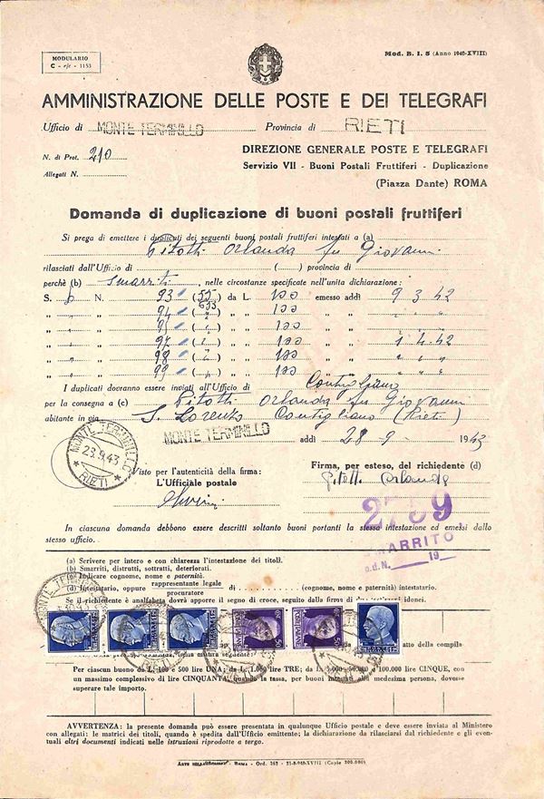 Imperiale - coppia del 50 cent (251) + quattro 1,25 lire (253) - intera Domanda di Duplicazione (Mod. B.I. 5) - Monteterminillo/Rieti 28.9.43