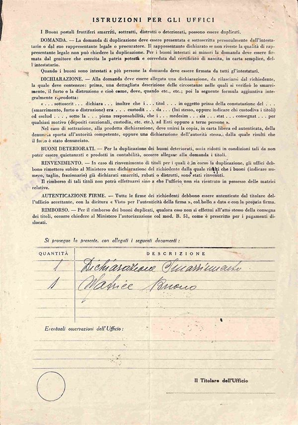 Imperiale - coppia del 75 cent (252) + coppia del 1,75 lire (254) su intera Domanda di Duplicazione (Mod. B.I. 5) - Cassano Magnago/Varese 11.10.43