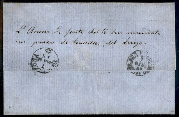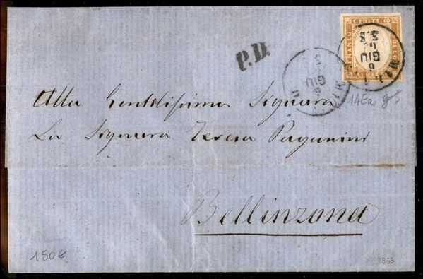 Lettera affrancata con 10 cent V. Emanuele II (14E) da Milano a Bellinzona del 6 giu. 63