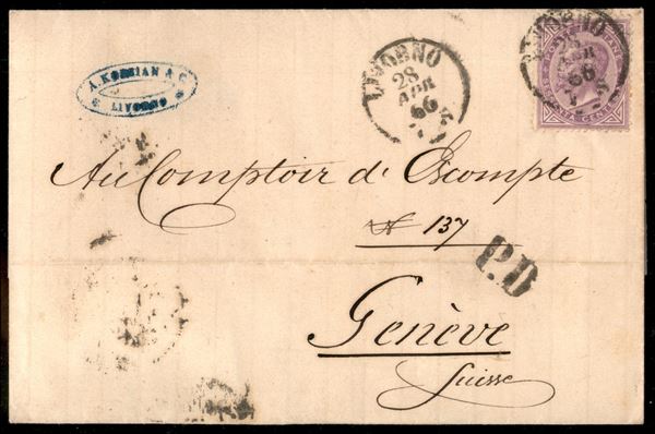 Lettera affrancata con 60 cent Vittorio Emanuele II (T21) da Livorno per Ginevra del 28.4.66