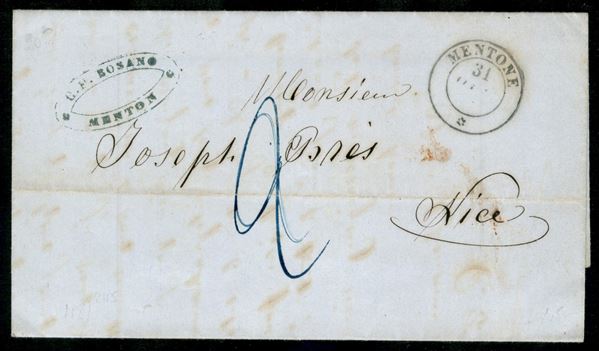 Lettera da Mentone 31 ott. 54 a Nizza con segno di tassa 2 decimi