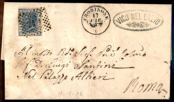 Lettera del 17.12.72 recante 20 cent (T26) bene dentellato - spedita da Vico nel Lazio (ovale di collettoria a lato) - ex coll. Provera
