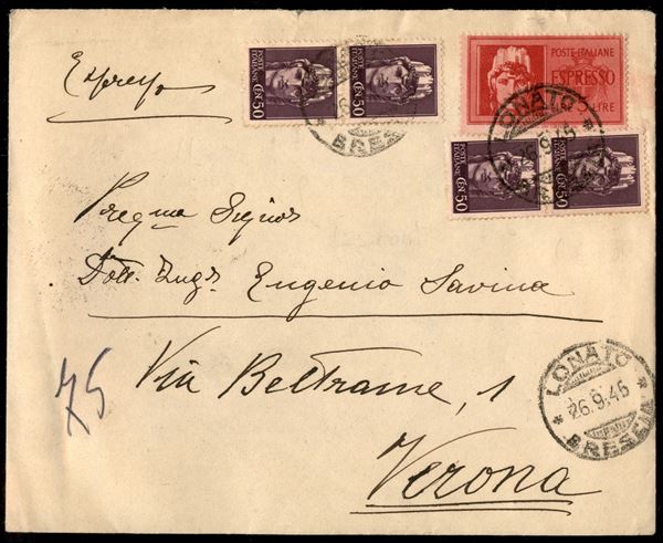 Lettera espresso da Lonato del 26.9.45 per Verona affrancata con due coppie del 50 cent Turrita + 5 lire Espressi (538 + Espressi 24)