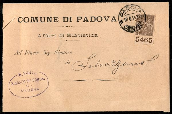 Lettera stampato affrancata con 1 cent Floreale (68) bordo di foglio in basso con numero di Tavola da Padova per Selvazzano del 19.8.13 - ex coll. Provera