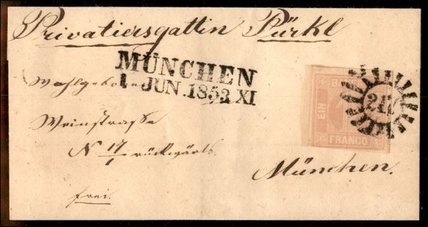 Letterina affrancata con 1 kreuzer Cifra (4) con tre grandi margini toccato in basso a sinistra - da Monaco per cittą del 1.6.53