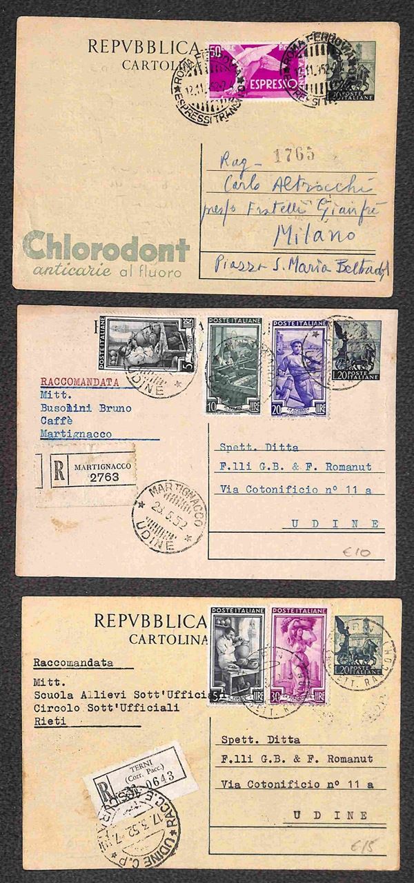Lotto di tre Cartoline Postali Quadriga 20 lire (C143) raccomandate o espresso con affrancature complementari