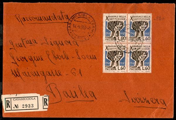 Quartina 60 lire Costituzione (830) su raccomandata per Basilea da Casamicciola del 14.9.959