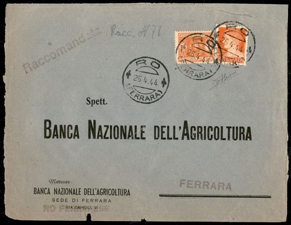 Raccomandata con Regno Imperiale 1,75 lire + 1 lira Segnatasse da Ro 26.4.44 per Ferrara - Sorani