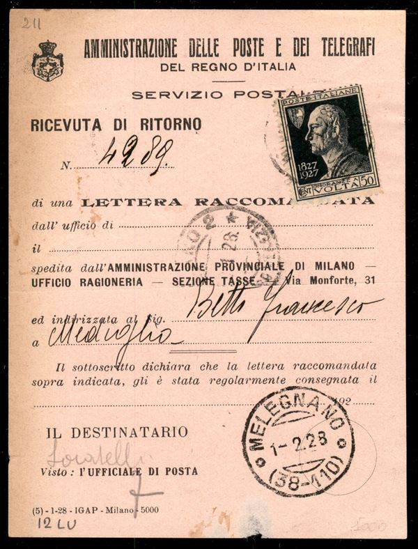 Ricevuta di ritorno recante 50 cent Volta (211) - Melegnano 1.2.28 - ex coll. Provera