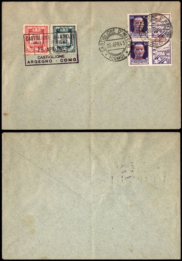 Stemma (14/15) + coppia del 50 cent Marina (33 Propaganda - RSI) usati su busta il 28.4.45