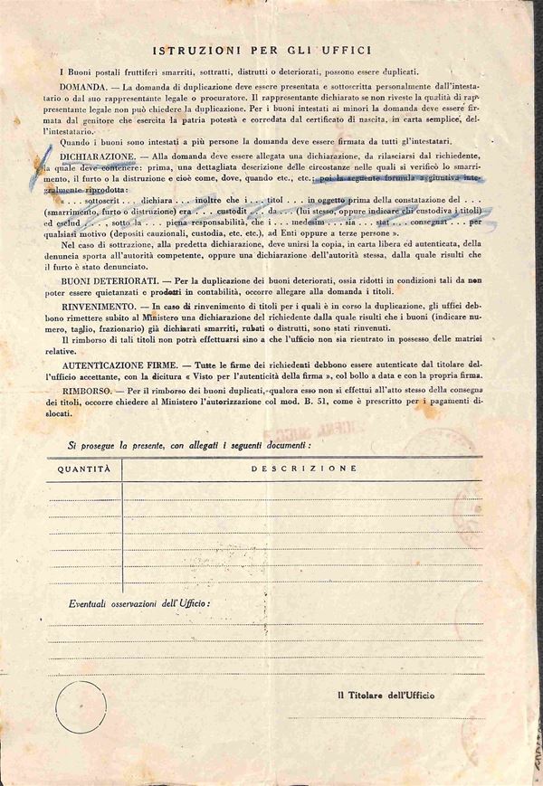 Striscia di sei del 50 cent Imperiale (251) su intera Domanda di Duplicazione (Mod. B.I. 5) - Modena 7.10.43