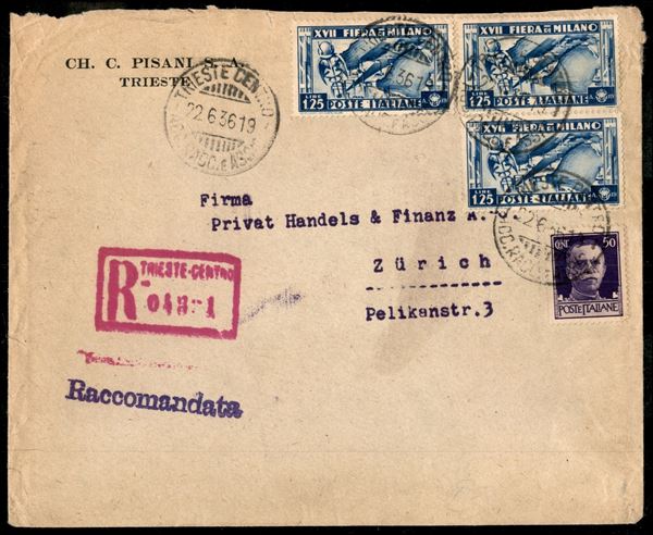 Tre 1,25 lire Fiera di Milano + 50 cent Imperiale (251 + 397) su raccomandata da Trieste per Zurigo del 22.6.36
