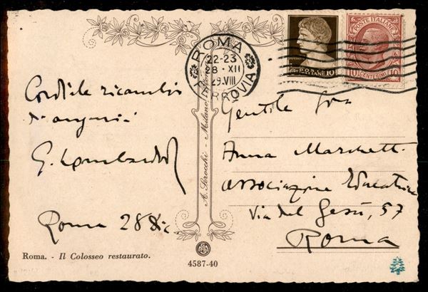 Valori gemelli 10 cent rosa Leoni (82) + Imperiale 10 cent bruno (245) su cartolina 5 parole da Roma 28.XII.29 - ex coll. Provera