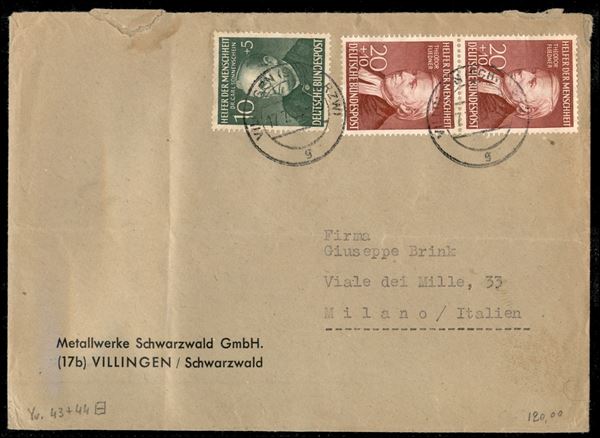 10 + 5 pfenning + due 20 + 10 pfenning Beneficenza (157/158) - busta da Villingen a Milano del 17.7.53
