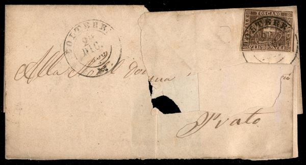 10 cent (19) leggermente difettoso a destra - parte di lettera da Volterra a Prato del 29.12.60