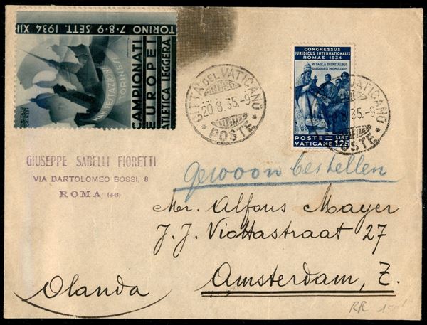 1,25 lire Giuridico (46) su lettera per Amsterdam del 20.8.35 - a lato etichetta Campionati Europei Atletica Leggera Torino 7-8-9 sett. 1934