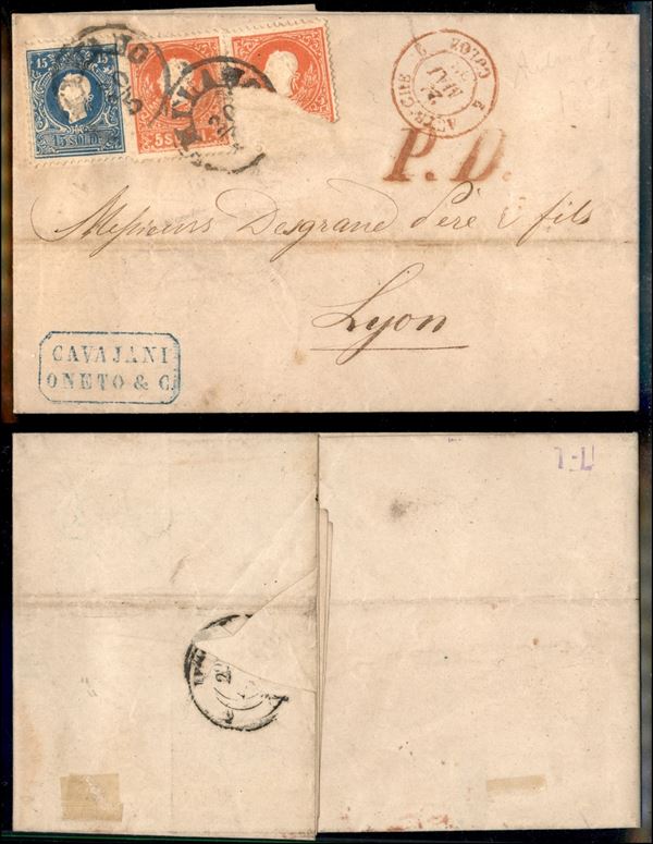15 soldi (32) + 5 soldi (30) + 5 soldi (30) strappato e mancante della parte inferiore - lettera da Milano a Lione del 20.5.59 - rara affrancatura bicolore