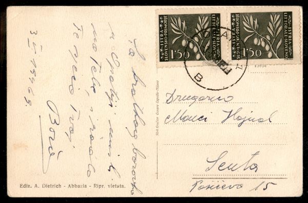 1,50 lire (44) in coppia su cartolina da Opatja del 3.5.46