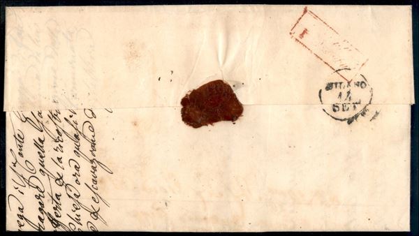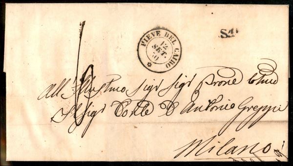 1850 Lettera con d.c. Pieve del Cairo 12 set. 50 + bollo S1 per Milano - segno di tassa 6 relativo alla prima distanza Sarda