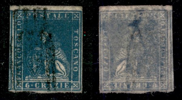 1857 - 6 crazie (15a - azzurro vivo) usato - carta sottile con decalco in trasparenza - lieve sfaldatura - da esaminare