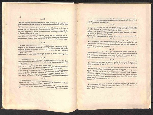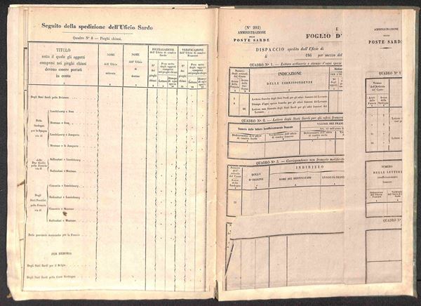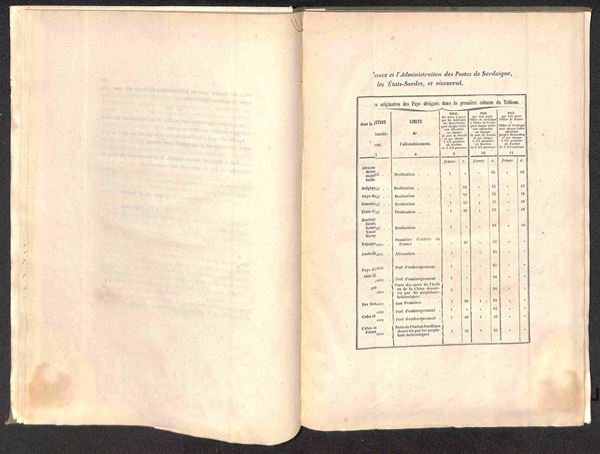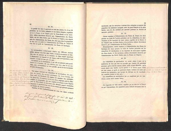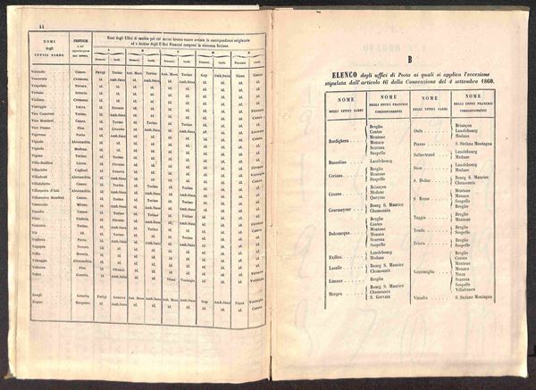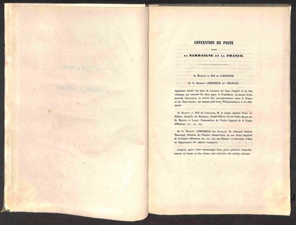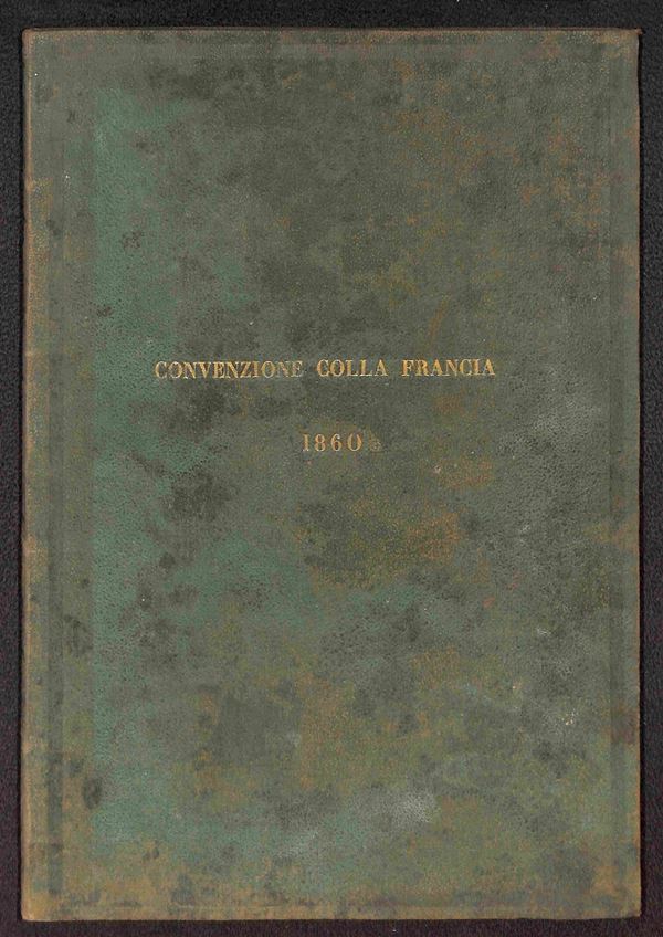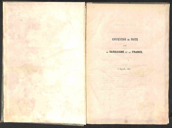 1860 (4 settembre) - Convenzione Postale Sardegna/Francia - fascicolo rilegato all’epoca di 44 pagine + 2 Quadri + 6 Moduli Amministrativi + Manifesto del 12 dicembre 1860 - raro insieme